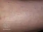 This benign patch appears on the skin at birth or in early childhood. In most people these are under 10 centimeters (3.9 in) in size. If there is doubt about the diagnosis, rubbing the area causes the skin around the lesion to become red while the lesion itself does not change in color.[3] Often the patches are difficult to see against the background color of the patient’s skin, but if sunburn develops, then the white area stands out prominently.[4] The involved area is lighter than the normal skin, not because of a loss of pigment occurs, but because blood vessels are constricted, producing a permanent blanching of the area. This blanching is a functional rather than a structural abnormality, presumed to be caused by local increased sensitivity to catecholamines.[5] Although the cutaneous vasculature appears normal histologically, the blood vessels within the nevus do not respond to injection of vasodilators. It has been postulated that the persistent pallor may represent a sustained localized adrenergic vasoconstriction.[6] Results of a skin biopsy would be interpreted as normal and only physiological testing can reveal the nevus in contrast to normal skin. Stroking the patch elicits no red flare. Only the normal skin would react with a characteristic erythematous response. Examination under a Wood lamp can also reveal the nevus anemicus patch will not emphasize as a patch of vitiligo would.[7]
