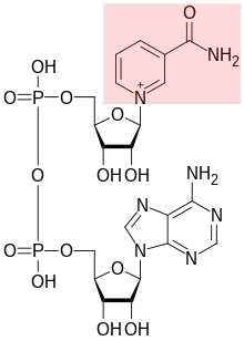 Nicotinamide occurs as a component of a variety of biological systems, including within the vitamin B family and specifically the vitamin B3 complex.[10][11] It is also a critically important part of the structures of NADH and NAD+, where the N-substituted aromatic ring in the oxidised NAD+ form undergoes reduction with hydride attack to form NADH.[31] The NADPH/NADP+ structures have the same ring, and are involved in similar biochemical reactions.