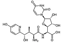 Nikkomycins are a group of antifungal medications.[1] They work by interfering with the building of the fungal cell wall which results in the fungal cell breaking open.[1] They were discovered in 1976.[1] The specific agent nikkomycin Z has weak activity against Aspergillus fumigatus which may be of benefit when used with other medications,[1] such as caspofungin, ranconazole and amphotericin B, fluconazole or itraconazole.[2] Nikkomycin Z also inhibits growth of Batrachochytrium dendrobatidis, a serious fungal pathogen linked to global amphibian declines, while lower concentrations of Nikkomycin Z enhanced natural amphibian antimicrobial skin peptide effectiveness in vitro.[3]