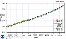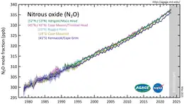 121. Thompson RL, Lassaletta L, Patra PK, Wilson C, Wells KC, Gressent A, et al. (18 November 2019). "Acceleration of global N 2 O emissions seen from two decades of atmospheric inversion". Nature Climate Change. 9 (12): 993–998. Bibcode:2019NatCC...9..993T. doi:10.1038/s41558-019-0613-7. hdl:11250/2646484. ISSN 1758-6798. S2CID 208302708.