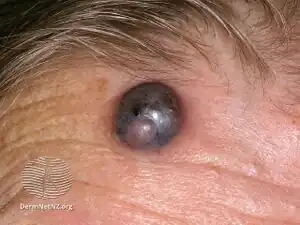 Nodular melanoma (NM) is the most aggressive form of melanoma.[1] It tends to grow more rapidly in thickness (vertically penetrate the skin) than in diameter compared to other melanoma subtypes.[2] Instead of arising from a pre-existing mole, it may appear in a spot where a lesion did not previously exist. Since NM tends to grow in depth more quickly than it does in width, and can occur in a place that did not have a previous lesion, the prognosis is often worse because it takes longer for a person to be aware of the changes.