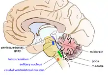 - ↑ Bruinstroop E, Cano G, Vanderhorst VG, Cavalcante JC, Wirth J, Sena-Esteves M, Saper CB (June 2012). "Spinal projections of the A5, A6 (locus coeruleus), and A7 noradrenergic cell groups in rats". The Journal of Comparative Neurology. 520 (9): 1985–2001. doi:10.1002/cne.23024. PMC 3508755. PMID 22173709.