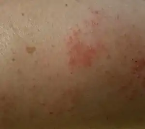 Nummular dermatitis is characterized by chronic or relapsing itchy coin-sized ovoid-shaped red plaques.[3][4] They can occur on the trunk, limbs, face, and hands.[1][2][5]