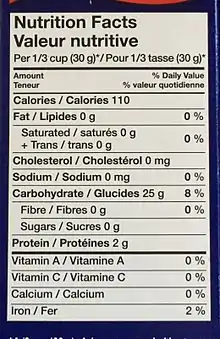 The label begins with a standard serving measurement, calories are listed second, and then following is a breakdown of the constituent elements including % daily value (%DV).[39] Always listed are total fat, sodium, carbohydrates and protein; the other nutrients usually shown may be suppressed, if they are zero. Usually all 15 nutrients are shown: calories, calories from fat, total fat, saturated fat, trans fat, cholesterol, sodium, carbohydrates, dietary fiber, sugars, protein, vitamin A, vitamin C, calcium, and iron.