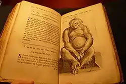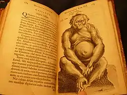 Tulp's book has various accounts of unusual illnesses and primarily growths or carcinomas, but also has accounts of creatures brought back from Dutch East India Company ships. His drawing of a chimpanzee is considered the first of its kind.[2] This creature was called an Indian Satyr, since all ships cargo was considered Indonesian. However, the accompanying text claims the animal came from Angola. This drawing was copied many times and formed the basis for many theories on the origin of man. Most notably, Tulp's work and that of Jacob de Bondt (alias Jacobus Bontius) was copied and republished by Linnaeus to show a link between apes and man.[2]