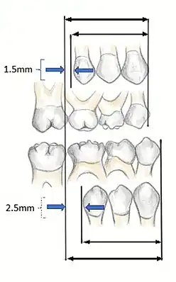 In order to fully understand the development of occlusion and malocclusion, it is important to understand the premolar dynamics in the mixed dentition stage. The mixed dentition stage is when both primary and permanent teeth are present. The permanent premolars erupt ~9–12 years of age, replacing the primary molars. The erupting premolars are smaller than the teeth they are replacing and this difference in space between the primary molars and their successors (1.5mm for maxillary, 2.5mm for mandibular[7]), termed Leeway Space. This allows the permanent molars to drift mesially into the spaces and develop a Class I occlusion.
