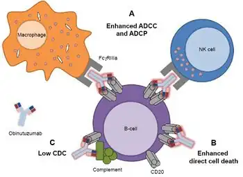 - ↑ Al-Sawaf, Othman; Fischer, Kirsten; Engelke, Anja; Pflug, Natali; Hallek, Michael; Goede, Valentin (25 January 2017). "Obinutuzumab in chronic lymphocytic leukemia: design, development and place in therapy". Drug Design, Development and Therapy. 11: 295–304. doi:10.2147/DDDT.S104869.