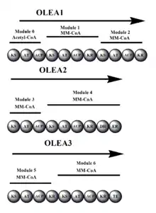 - The gene cluster OLES1 codes for modules 0-2, module 0 containing an acetyl-CoA starter unit and all remaining moduless carrying a methyl malonyl-CoA elongation unit attached to its keto synthase unit.