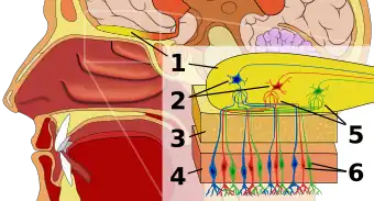 Olfactory sensory neurons in the epithelium detect odor molecules dissolved in the mucus and transmit information about the odor to the brain in a process called sensory transduction.[4][5] Olfactory neurons have cilia (tiny hairs) containing olfactory receptors that bind to odor molecules, causing an electrical response that spreads through the sensory neuron to the olfactory nerve fibers at the back of the nasal cavity.[2]