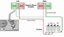 ignored (help) - ↑ Warr, WB.; Beck, JE.; Neely, ST. (1997). "Efferent innervation of the inner hair cell region: origins and terminations of two lateral olivocochlear systems". Hear Res. 108 (1): 89–111. doi:10.1016/S0378-5955(97)00044-0. PMID 9213126. S2CID 4761304.