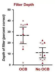 In humans, psychophysical experiments conducted in constant BGN have also implicated the olivocochlear bundle (OCB) in selective listening. The research perhaps most relevant to this thesis has been performed by Scharf and his colleagues. In 1993, Scharf et al. presented data from eight patients who had undergone unilateral vestibular neurectomy to treat Ménière's disease, a procedure which severs the OCB (presumably both the MOCS and the LOCS). Scharf et al. (1993) did not find any clear differences in subjects' thresholds to tones in noise before and after surgery. Shortly after this finding, Scharf et al. (1994, 1997) performed a comprehensive set of psychophysical experiments from a total of sixteen patients who had undergone unilateral vestibular neurectomy (including the original eight subjects).[26][27] They measured performance in the psychophysical listening tasks before and after surgery, and found no significant difference in performance for (i) detection of tones, (ii) intensity discrimination of tones, (iii) frequency discrimination of tones, (iv) loudness adaptation, and (v) detection of tones in notched-noise.[26][27] Their only positive finding was that most patients detected unexpected sounds in the operated ear better than in the healthy ear, or the same ear before surgery. This result was obtained using a truncated probe-signal procedure which led the patient to expect a certain frequency on each trial. Twelve subjects completed this experiment.[26][27] Their procedure was similar to that of Greenberg and Larkin (1968), except only 50% of trials (not 77%) contained a target whose frequency matched that of the auditory cue. The other 50% of trials containing a probe whose frequency differed from that of the cue. Also, only two probe frequencies were used, one whose frequency was higher than the target, and one whose frequency was lower than the target. All trials contained an auditory cue (at the target frequency) prior to the first observation interval. The results were used to construct a basic attentional filter, which displayed detection level of the expected (and cued) target frequency and the two unexpected probe frequencies.[26][27] From the two published reports (Scharf et al., 1994, 1997), ears for which the OCB has been lesioned showed an attentional filter with an average depth of about 15%-correct less than those ears for which the OCB was intact.[26][27] Although there is no way to empirically convert this value to dB, a rough estimate based on psychometric functions presented by Green and Swets (1966) yields a value of 2-3 dB. Their results have been summarised in the inset figure.[26]