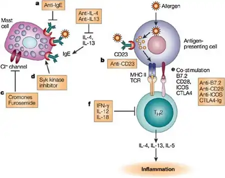 - 1 2 3 Chang TW, Shiung YY (June 2006). "Anti-IgE as a mast cell-stabilizing therapeutic agent". The Journal of Allergy and Clinical Immunology. 117 (6): 1203–12. doi:10.1016/j.jaci.2006.04.005. PMID 16750976.