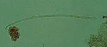 The release of oocytes (eggs) in female worms does not depend upon the presence of a male worm, although they may attract male worms using unidentified pheromones.[8] The first larval stage, microfilariae, are 300 μm in length and unsheathed, meaning that when they mature into microfilariae, they exit from the envelope of the egg.[9]