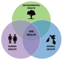 One Health is an approach calling for "the collaborative efforts of multiple disciplines working locally, nationally, and globally, to attain optimal health for people, animals and our environment", as defined by the One Health Initiative Task Force (OHITF).[2] It developed in response to evidence of the spreading of zoonotic diseases between species and increasing awareness of "the interdependence of human and animal health and ecological change".[3]: 205 [4] In this viewpoint, public health is no longer seen in purely human terms.[5][6] Due to a shared environment and highly conserved physiology, animals and humans not only suffer from the same zoonotic diseases but can also be treated by either structurally related or identical drugs. For this reason, special care must be taken to avoid unnecessary or over-treatment of zoonotic diseases, particularly in the context of drug resistance in infectious microbes.[7]