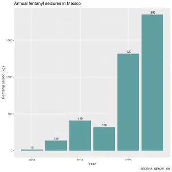 According to the United States Drug Enforcement Agency in 2023, China continued to be the primary source of fentanyl being imported into the United States, killing over 100 Americans every day.[125] Over a two-year period, close to $800 million worth of fentanyl pills were illegally sold online to the US by Chinese distributors.[126][127] The drug is usually manufactured in China, then shipped to Mexico, where it is processed and packaged, which is then smuggled into the US by drug cartels.[128] A large amount is also purchased online and shipped through the US Postal Service.[129] It can also be purchased directly from China, which has become a major manufacturer of various synthetic drugs illegal in the US.[130] AP reporters found multiple sellers in China willing to ship carfentanyl, an elephant tranquilizer that is so potent it has been considered a chemical weapon. The sellers also offered advice on how to evade screening by US authorities.[131] According to Assistant US Attorney, Matt Cronin:
