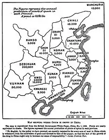 Map showing the amount of opium produced in China in 1908: The quote "We English, by the policy we have pursued, are morally responsible for every acre of land in China which is withdrawn from the cultivation of grain and devoted to that of the poppy; so that the fact of the growth of the drug in China ought only to increase our sense of responsibility." is by Lord Justice Fry.