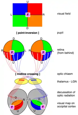 Figure 2 Transformations of the visual field toward the visual map on the primary visual cortex in vertebrates. U=up; D=down; L=left; R=right; F=fovea