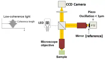 The "en-face" tomographic images are thus produced by a wide-field illumination, ensured by the Linnik configuration of the Michelson interferometer where a microscope objective is used in both arms. Furthermore, while the temporal coherence of the source must remain low as in classical OCT (i.e. a broad spectrum), the spatial coherence must also be low to avoid parasitical interferences (i.e. a source with a large size).[67]