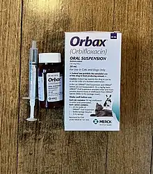 Orbifloxacin (brand name Orbax) is a fluoroquinolone antibiotic which is approved for use in dogs,[1][2] marketed by Schering-Plough Animal Health.