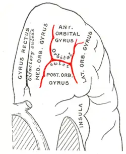 The inferior or orbital surface of the frontal lobe is concave, and rests on the orbital plate of the frontal bone. It is divided into four orbital gyri by a well-marked H-shaped orbital sulcus