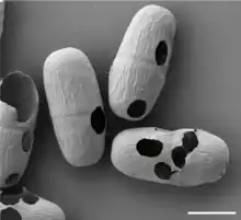 In particular, Orciraptor agilis has a gliding velocity averaging 12 μm per second, and a flapping frequency of the anterior flagellum of 1.4–2.3 beats per second at a temperature of 20°C. It is capable of perforating algal cell walls in a circular manner, often leaving behind cell wall lids attached to empty algal cells (see image 1). It leaves elliptical holes on the cell wall (see image 2), measuring 9–11 μm in the largest dimension, seen in Mougeotia prey. It has at least three strategies of feeding:[1]