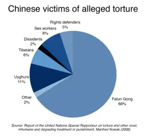 Former Chinese prisoners have also reported that Falun Gong practitioners consistently received the "longest sentences and worst treatment" in the camps, and that they are singled out for torture and abuse.[43][95] In 2006, a study by the UN's Special Rapporteur on Torture noted that 66% of reported cases from China involved Falun Gong victims.[96] Thousands of Falun Gong practitioners have died or been killed in custody, often under disputed circumstances.[38][43] Family members of the deceased have reported being denied an autopsy;[97] in some instances bodies were summarily cremated without the family's consent.[98] Analysts and rights groups have pointed to several factors that drive the especially severe treatment against Falun Gong practitioners in custody. These include directives issued from central government or Communist Party authorities;[99] incentives and quota systems that encourage abuse;[43] a sense of impunity in the event of deaths in custody;[100] and the effects of the state propaganda that dehumanizes and vilifies Falun Gong practitioners.[42][101]
