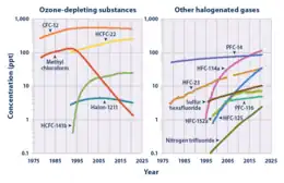 Atmospheric concentration of several halocarbons, years 1978–2015.