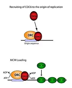 The ORC is essential for the loading of MCM complexes (Pre-RC) onto DNA. This process is dependent on the ORC, Noc3, Cdc6, and Cdt1 – involving several ATP controlled recruiting events. First, the ORC, Noc3p and Cdc6 form a complex on origin DNA (marked by ARS type regions). New ORC/Noc3/Cdc6 complexes then recruit Cdt1/Mcm2-7 molecules to the site. Once this massive ORC/Noc3/Cdc6/Cdt1/Mcm2-7 complex is formed, the ORC/Noc3/Cdc6/Cdt1 molecules work together to load Mcm2-7 onto the DNA itself by hydrolysis of ATP by Cdc6. Cdc6's phosphorylative activity is dependent on both the ORC and origin DNA. This leads to Cdt1 having decreased stability on the DNA and falling off of the complex leading to Mcm2-7 loading on to the DNA.[29][27][30][31] The structure of the ORC, MCM, as well as the intermediate OCCM complex has been resolved.[32]