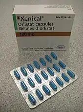 Orlistat, sold under the brand name Xenical among others, is a medication used to treat obesity.[2] The effectiveness is modest with people losing about 2–3 kilograms (4.4–6.6 lb) more over the course of a year.[4] It reduces the risk of type II diabetes in people who are obese similar to lifestyle changes.[5] It is taken by mouth.[2]