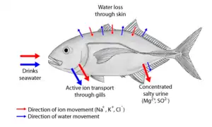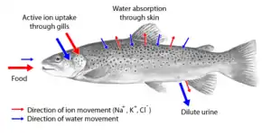 In teleost (advanced ray-finned) fishes, the gills, kidney and digestive tract are involved in maintenance of body fluid balance, as the main osmoregulatory organs. Gills in particular are considered the primary organ by which ionic concentration is controlled in marine teleosts.