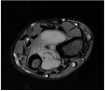 Distal radioulnar joint shows calcified nodules consistent with synovial osteochondromatosis. | |