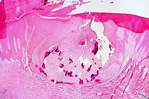 Osteoma cutis is a cutaneous condition characterized by the presence of bone within the skin in the absence of a preexisting or associated lesion.[2]: 529