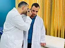 An otoscope or auriscope is a medical device that a doctor or other health care worker uses to look into a patient's ears.[1] Health care providers use otoscopes to screen for illness during regular check-ups and also to investigate ear symptoms.