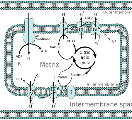 - ↑ Schägger H, Pfeiffer K (2001). "The ratio of oxidative phosphorylation complexes I-V in bovine heart mitochondria and the composition of respiratory chain supercomplexes". J. Biol. Chem. 276 (41): 37861–7. doi:10.1074/jbc.M106474200. PMID 11483615. Archived from the original on 2007-09-29.