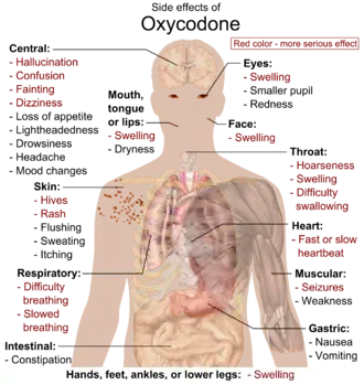 Serious side effects of oxycodone include reduced sensitivity to pain (beyond the pain the drug is taken to reduce), euphoria, anxiolysis, feelings of relaxation, and respiratory depression.[40] Common side effects of oxycodone include constipation (23%), nausea (23%), vomiting (12%), somnolence (23%), dizziness (13%), itching (13%), dry mouth (6%), and sweating (5%).[40][41] Less common side effects (experienced by less than 5% of patients) include loss of appetite, nervousness, abdominal pain, diarrhea, urine retention, dyspnea, and hiccups.[42] Most side effects generally become less intense over time, although issues related to constipation are likely to continue for the duration of use.[43] Oxycodone in combination with naloxone in managed-release tablets, has been formulated to both deter abuse and reduce "opioid-induced constipation".[44]