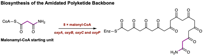 The biosynthesis of oxytetracycline begins with the utilization of PKS enzymes ketosynthase (KS), the chain length factor (CLF), the acyl carrier protein (ACP), and an acyltransferase (encoded as OxyA, OxyB, OxyC and OxyP in the oxytetracycline gene cluster)[11] to catalyze the extension of the malonamyl-CoA starting unit with eight malonyl-CoA extender units. The process of elongating the polypeptide skeleton occurs through a series of Claisen-like decarboxylation reactions until the linear tetracyclic skeleton is formed.[12] Thus, minimal PKS's form a completed amidated polyketide backbone without any additional post-synthase tailoring enzymes (Figure 1).