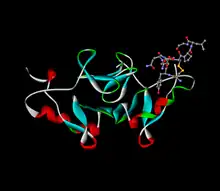 Oxytocin (ball-and-stick) bound to its carrier protein neurophysin (ribbons)