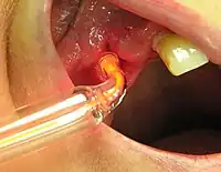 In 1892 The Lancet published an article describing the administration of ozone for treatment of tuberculosis.[38] During World War I, ozone was tested at Queen Alexandra Military Hospital in London as a possible disinfectant for wounds. The gas was applied directly to wounds for as long as 15 minutes. This resulted in damage to both bacterial cells and human tissue. Other sanitizing techniques, such as irrigation with antiseptics, were found preferable.[39][40]