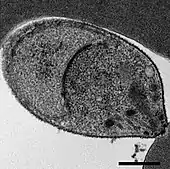 As an apicomplexan, P. knowlesi has several distinctive structures at its apical end that are specialized for invading host cells. These include the large bulbous rhoptries, smaller micronemes, and dispersed dense granules, each of which secretes effectors to enter and modify the host cell.[2][3] Like other apicomplexans, P. knowlesi also has two organelles of endosymbiotic origin: a single large mitochondrion and the apicoplast, both of which are involved in the parasite's metabolism.[4]