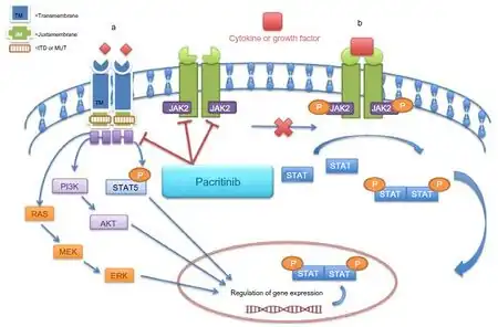 - ↑ Mascarenhas, John (August 2022). "Pacritinib for the treatment of patients with myelofibrosis and thrombocytopenia". Expert Review of Hematology. 15 (8): 671–684. doi:10.1080/17474086.2022.2112565. ISSN 1747-4094. Archived from the original on 7 May 2023. Retrieved 1 June 2024.
