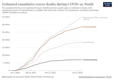 SARS-CoV-2, a new strain of coronavirus, was first detected in the city of Wuhan, Hubei Province, China, in December 2019.[58] The outbreak was characterized as a Public Health Emergency of International Concern (PHEIC) between January 2020 and May 2023 by WHO.[59][60] The number of people infected with COVID-19 has reached more than 767 million worldwide, with a death toll of 6.9 million.[lower-alpha 3][61] It is considered likely that the virus will eventually become endemic and, like the common cold, cause less severe disease for most people.[62]