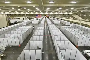 Early in the COVID-19 pandemic, convention centers (pictured here) were deemed to be ideal sites for temporary hospitals, due to their existing infrastructure (electrical, water, sewage).[11] Hotels and dormitories were also considered appropriate because they can use negative pressure technology.[11]