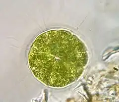 The colonies co-ordinate their flagellar movement to create a rolling, swimming motion. Pandorina shows the beginnings of the colony polarity and differentiation seen in Volvox since the anterior cells have larger eyespots. Molecular sequencing has shown that Pandorina is paraphyletic with respect to Volvulina.[2][3][4]