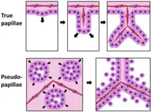 Papillae vs pseudopapillae: True papillae are outgrowths of epithelium, surrounding fibrovascular cores of stroma and at least one blood vessel. In contrast, pseudopapillae (such as in solid pseudopapillary tumors) are nests of proliferating cells that eventually grow to become almost back-to-back, with cells in the centers of nests disintegrating, leaving rims of cells lining the periphery of each nest. Discohesive cells and some formations lacking central blood vessels are visual clues.