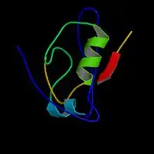 E6 can also bind to PDZ-domains, short sequences which are often found in signaling proteins. E6's structural motif allows for interaction with PDZ domains on DLG (discs large) and hDLG (Drosophila large) tumor suppressor genes.[49][53] Binding at these locations causes transformation of the DLG protein and disruption of its suppressor function. E6 proteins also interact with the MAGUK (membrane-associated guanylate kinase family) proteins. These proteins, including MAGI-1, MAGI-2, and MAGI-3 are usually structural proteins, and can help with signaling.[49][53] More significantly, they are believed to be involved with DLG's suppression activity. When E6 complexes with the PDZ domains on the MAGI proteins, it distorts their shape and thereby impedes their function. Overall, the E6 protein serves to impede normal protein activity in such a way as to allow a cell to grow and multiply at the increased rate characteristic of cancer.