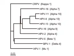 Phylogenetic studies strongly suggest that PVs normally evolve together with their mammalian and bird host species, but adaptive radiations, occasional zoonotic events and recombinations may also impact their diversification.[23] Their basic genomic organization appears maintained for a period exceeding 100 million years, and these sequence comparisons have laid the foundation for a PV taxonomy, which is now officially recognized by the International Committee on Taxonomy of Viruses. All PVs form the family Papillomaviridae, which is distinct from the Polyomaviridae thus eliminating the term Papovaviridae. Major branches of the phylogenetic tree of PVs are considered genera, which are identified by Greek letters. Minor branches are considered species and unite PV types that are genomically distinct without exhibiting known biological differences. This new taxonomic system does not affect the traditional identification and characterization of PV "types" and their independent isolates with minor genomic differences, referred to as "subtypes" and "variants", all of which are taxa below the level of "species".[24] Additionally, phylogenetic groupings at higher taxonomic level have been proposed.[25]