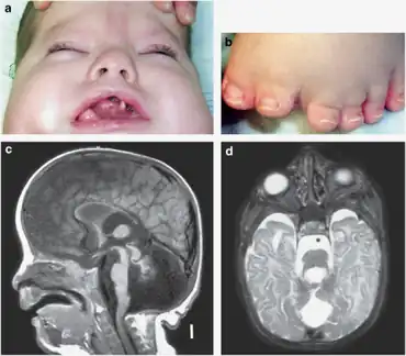 - ↑ Poretti, Andrea; Vitiello, Giuseppina; Hennekam, Raoul CM; Arrigoni, Filippo; Bertini, Enrico; Borgatti, Renato; Brancati, Francesco; D'Arrigo, Stefano; Faravelli, Francesca (2012-01-11). "Delineation and Diagnostic Criteria of Oral-Facial-Digital Syndrome Type VI". Orphanet Journal of Rare Diseases. 7: 4. doi:10.1186/1750-1172-7-4. ISSN 1750-1172. PMC 3313869. PMID 22236771.