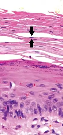 Parakeratosis is a mode of keratinization characterized by the retention of nuclei in the stratum corneum.[1] In mucous membranes, parakeratosis is normal.[2] In the skin, this process leads to the abnormal replacement of annular squames with nucleated cells. Parakeratosis is associated with the thinning or loss of the granular layer and is usually seen in diseases of increased cell turnover, whether inflammatory or neoplastic. Parakeratosis is seen in the plaques of psoriasis and in dandruff.