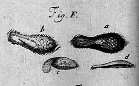 Paramecium were among the first ciliates to be observed by microscopists, in the late 17th century. They were most likely known to the Dutch pioneer of protozoology, Antonie van Leeuwenhoek, and were clearly described by his contemporary Christiaan Huygens in a letter from 1678.[4] The earliest known illustration of a Paramecium species was published anonymously in Philosophical Transactions of the Royal Society in 1703.[5]
