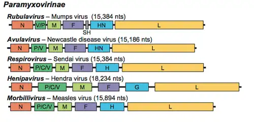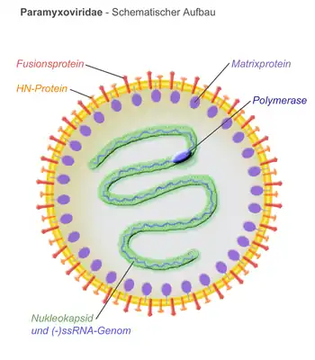 Virions are enveloped and can be spherical or pleomorphic and capable of producing filamentous virions. The diameter is around 150 nm. Genomes are linear, around 15kb in length.[6][1] Fusion proteins and attachment proteins appear as spikes on the virion surface. Matrix proteins inside the envelope stabilise virus structure. The nucleocapsid core is composed of the genomic RNA, nucleocapsid proteins, phosphoproteins and polymerase proteins.[7][8]